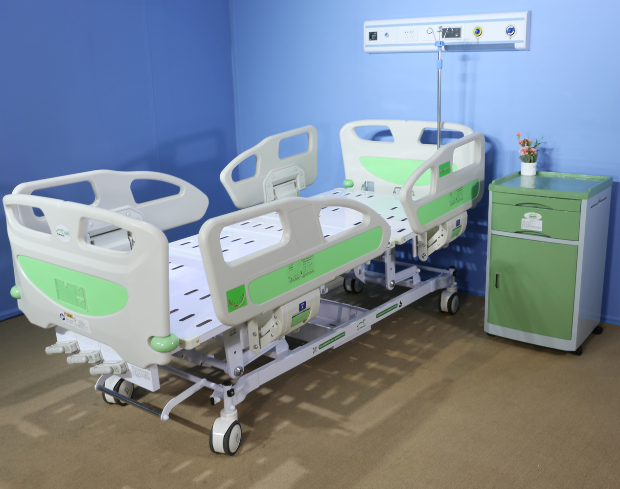 Product Name : New Luxury Three Manual Crank Care Bed With New long PP Siderails/ Heard Board with pumper wheels